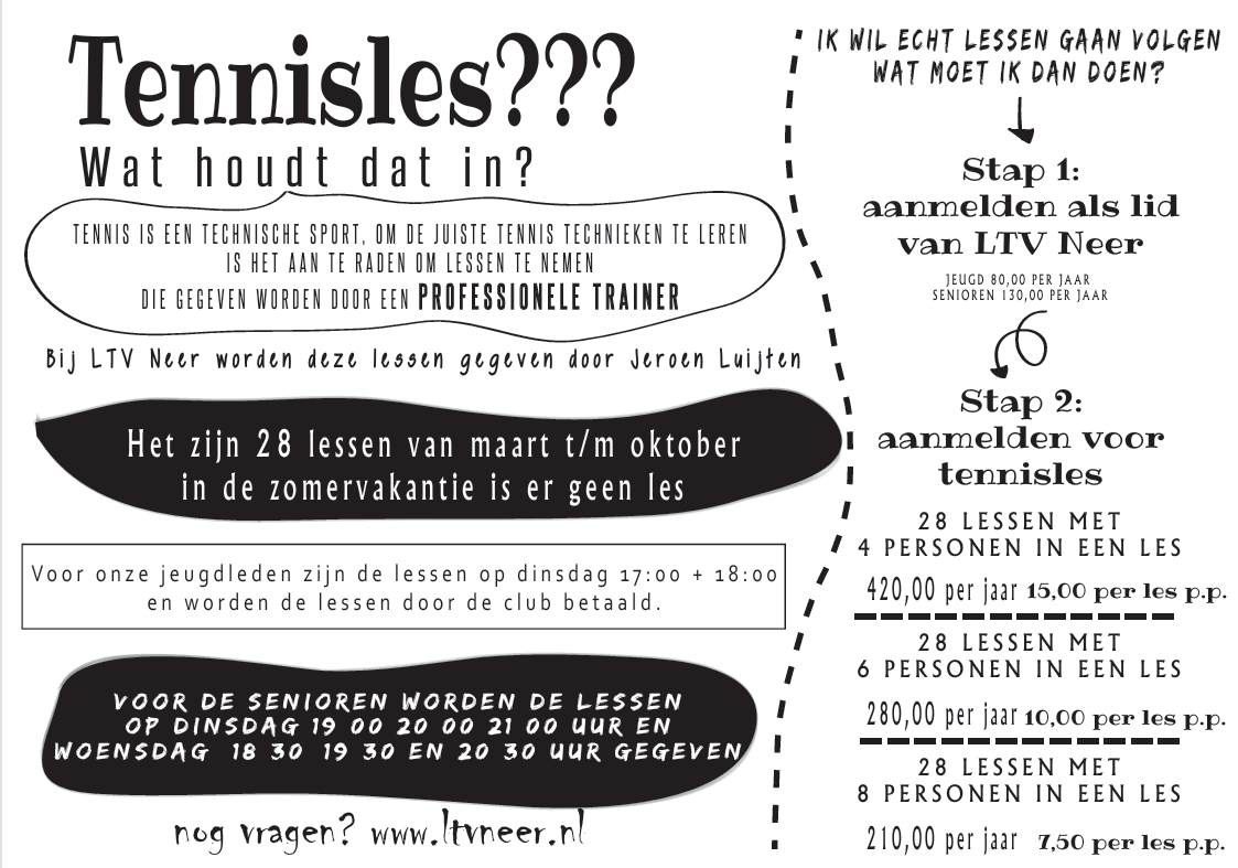 In de afbeelding vind je de belangrijkste informatie over het volgen van tennislessen. Daarnaast vind je onder het kopje Traingingen nog meer informatie. Wil je je aanmelden? Stuur dan een mailtje naar [email protected] ![]()